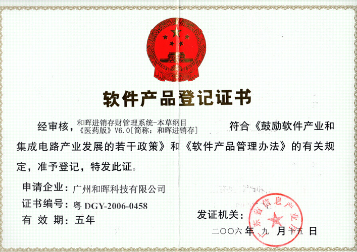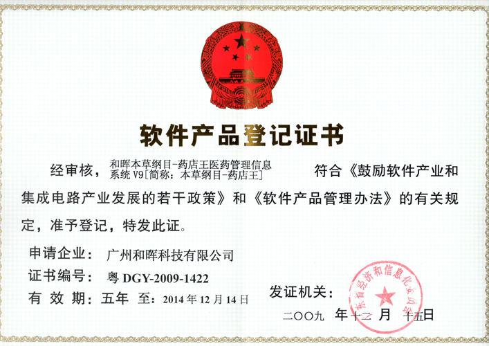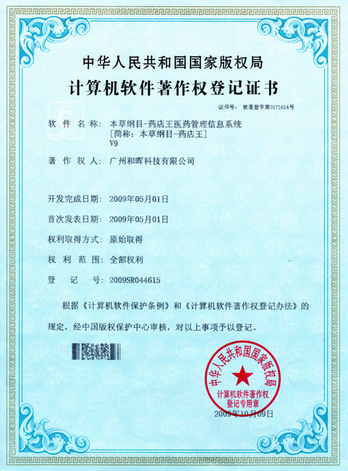 本草綱目-藥店王醫(yī)藥管理信息系統(tǒng)版權(quán)登記證書 | 和暉進(jìn)銷存財(cái)管理系統(tǒng)-本草綱目《醫(yī)藥版》軟件登記證書 |