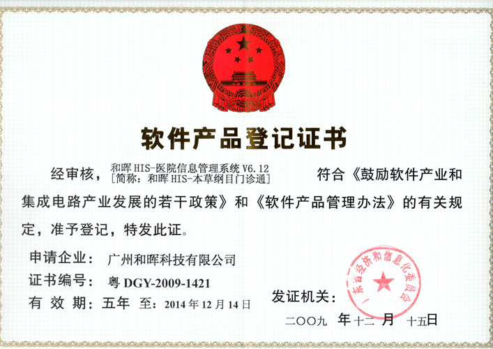 2014-2019年和暉HIS-醫(yī)院信息管理系統(tǒng)V6.12-軟件產(chǎn)品HIS證書 | 2014-2019年和暉本草綱目-藥店王醫(yī)藥管理信息系統(tǒng)-軟件產(chǎn)品藥店王證書 |