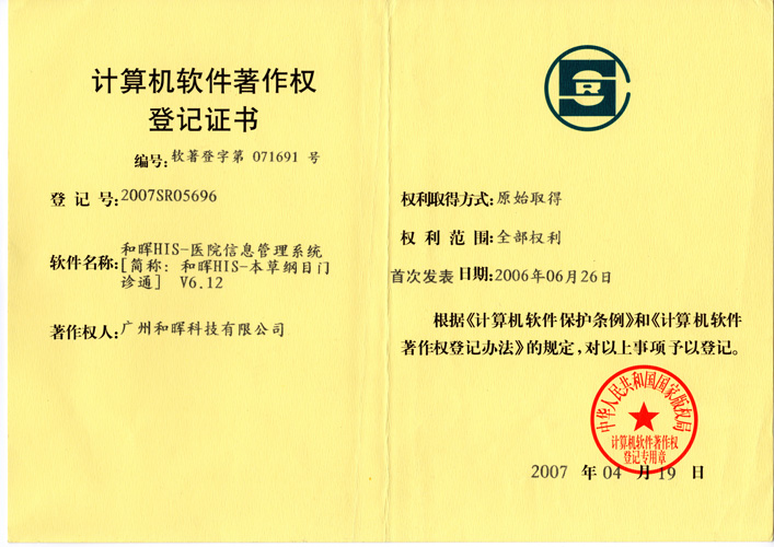 和暉HIS-醫(yī)院信息管理系統(tǒng)【和暉HIS-本草綱目門診通】軟件登記證書 | 和暉HIS-醫(yī)院信息管理系統(tǒng)【和暉HIS-本草綱目門診通】軟件登記證書 |