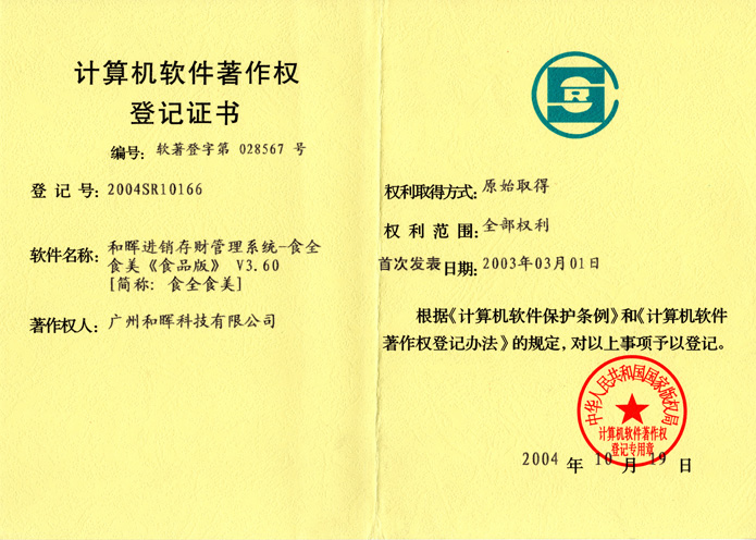和暉HIS-醫(yī)院信息管理系統(tǒng)【和暉HIS-本草綱目門診通】著作權(quán)登記證書 | 和暉進(jìn)銷存財(cái)管理系統(tǒng)-食全食美《食品版》計(jì)算機(jī)軟件著作權(quán)登記證書 |